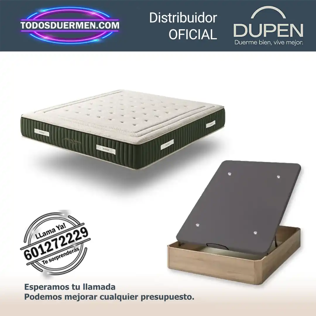 Colchones de muelles ensacados Natural Green Dupen 31 cm con canapé abatible Génova Plus, firmeza equilibrada, viscoelástica de alta densidad y confort transpirable natural.